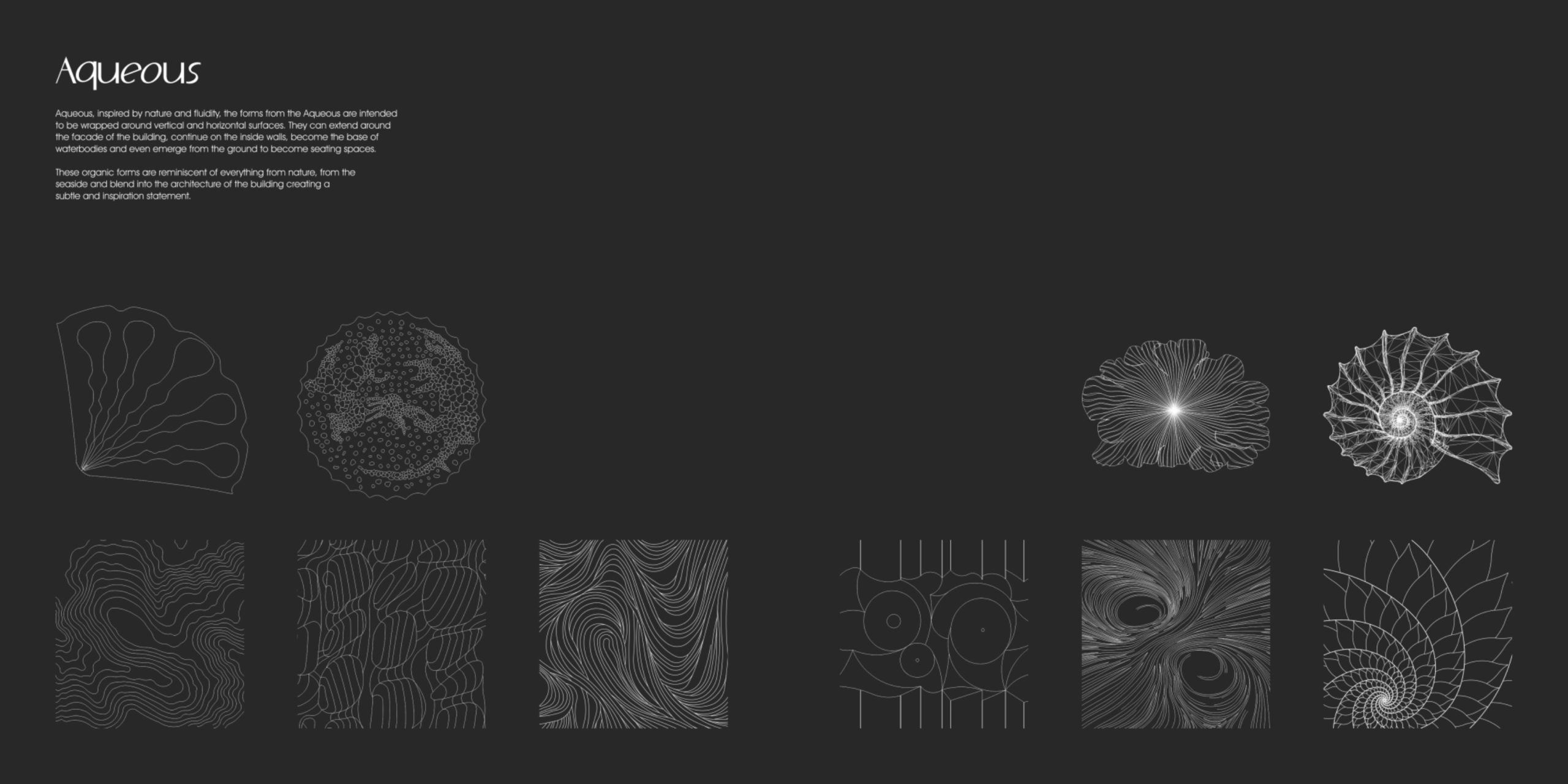 Aqueous, inspired by nature and fluidity, the forms from the Aqueous are intended to be wrapped around vertical and horizontal surfaces. They can extend around the facade of the building, continue on the inside walls, become the base of waterbodies and even emerge from the ground to become seating spaces.